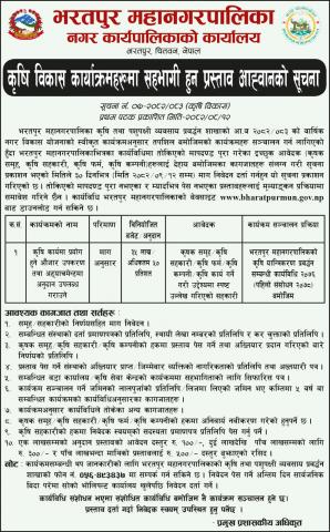 कृषि विकास कार्याक्रमहरुमा सहभागी हुन प्रस्ताव आव्हानको सूचना सूचना नं.0५-२०८२/०८३ (कृषि विकास) प्रथम पटक प्रकाशित मिति- २०८२/०८/१२