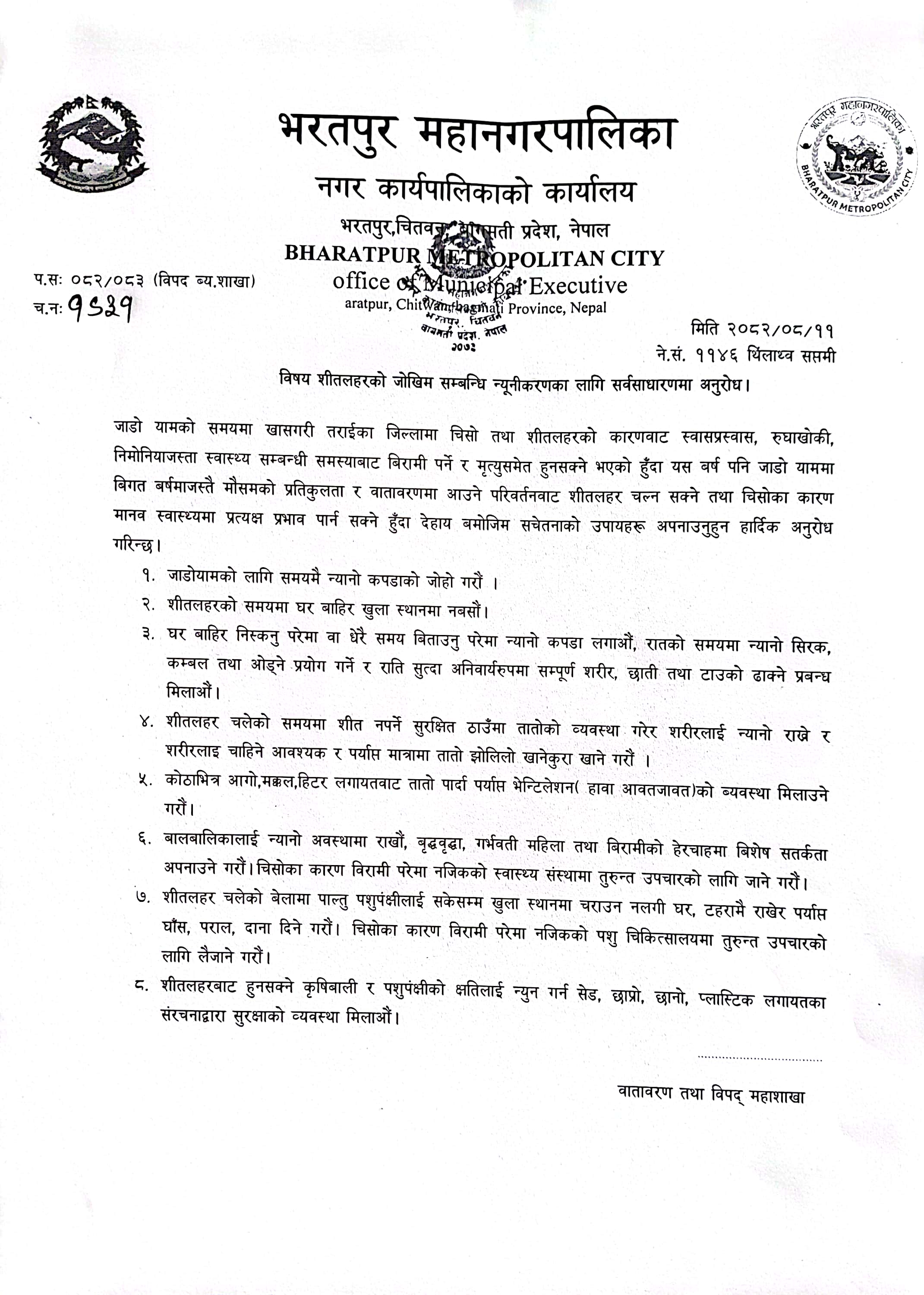 Home » शीतलहरको जोखिम सम्बन्धि न्यूनीकरणका लागि सर्वसाधारणमा अनुरोध ।