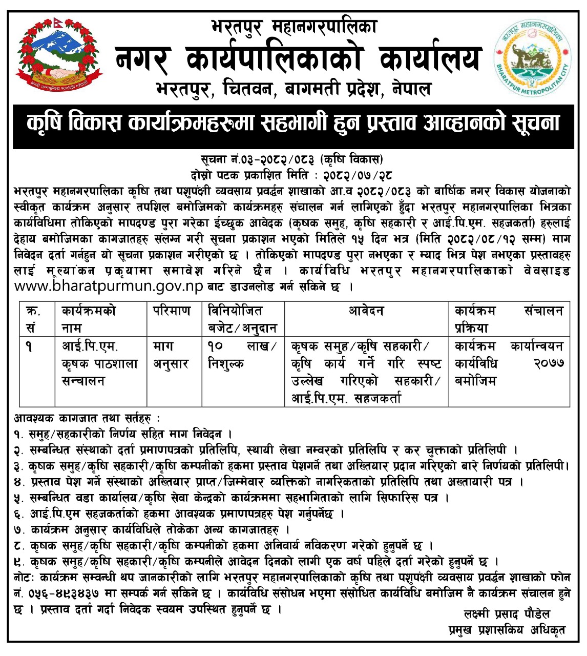 » कृषि विकास कार्याक्रमहरुमा सहभागी हुन प्रस्ताव आव्हानको सूचना!