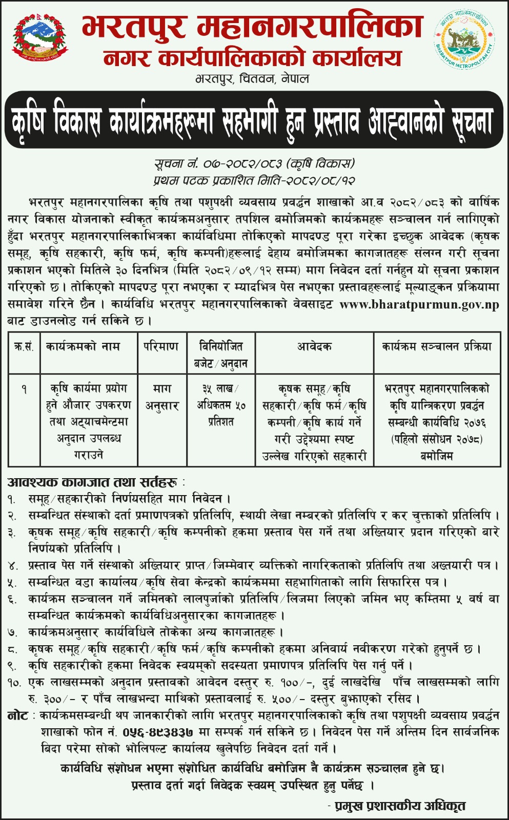 कृषि विकास कार्याक्रमहरुमा सहभागी हुन प्रस्ताव आव्हानको सूचना! सूचना नं.0७-२०८२०८३ (कृषि विकास) प्रथम पटक प्रकाशित मिति- २०८२-०८-१२