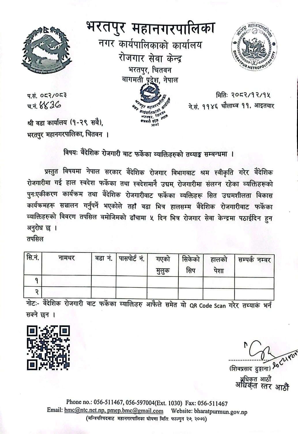 Home » बिदेशिक रोजगारबाट फर्केका व्यक्तिहरुको तथ्यांक सम्बन्धमा ।