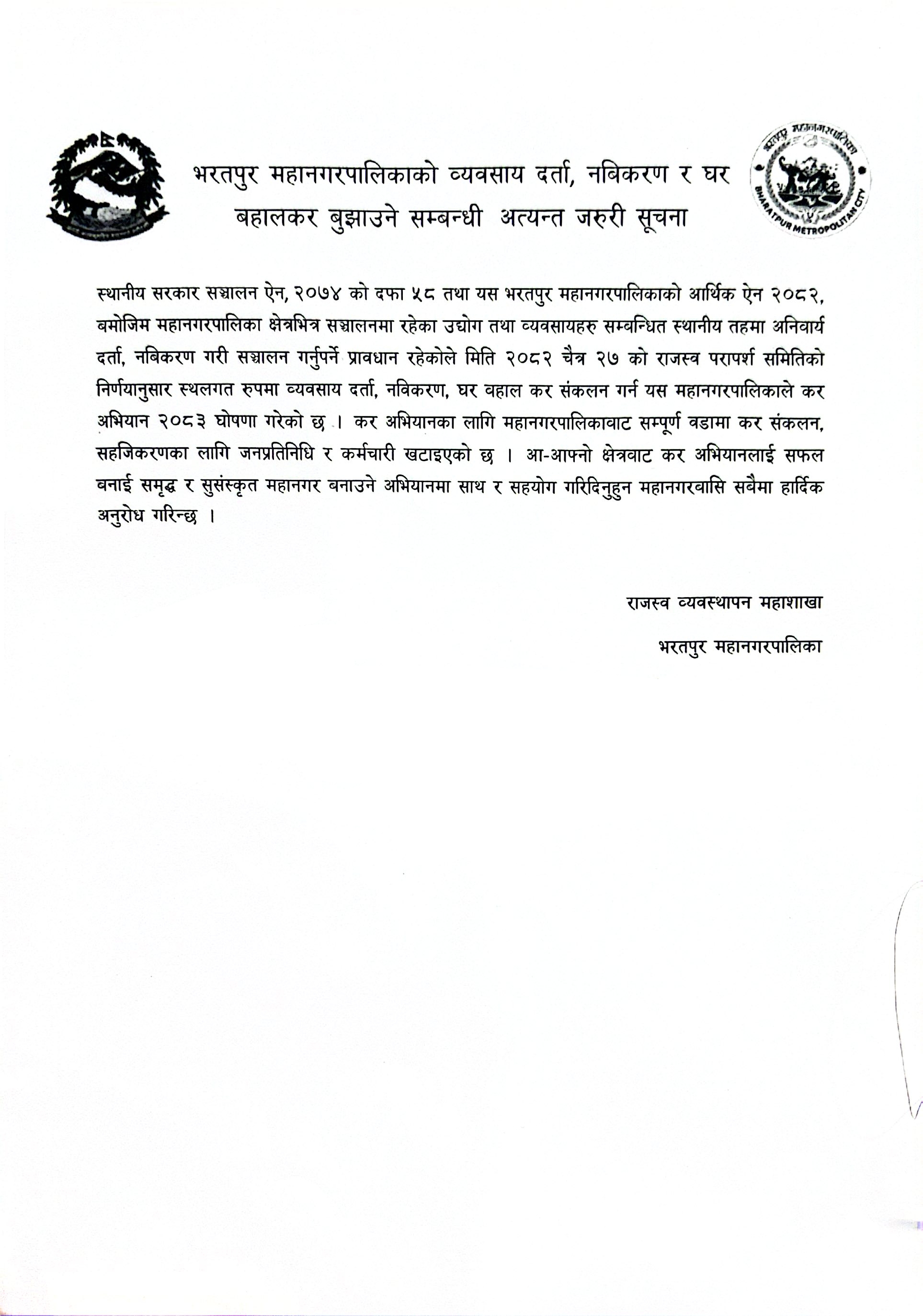 भरतपुर महानगरपालिकाको व्यवसाय दर्ता, नबिकरण र घर बहालकर बुझाउने सम्बन्धी अत्यन्त जरुरी सूचना ।