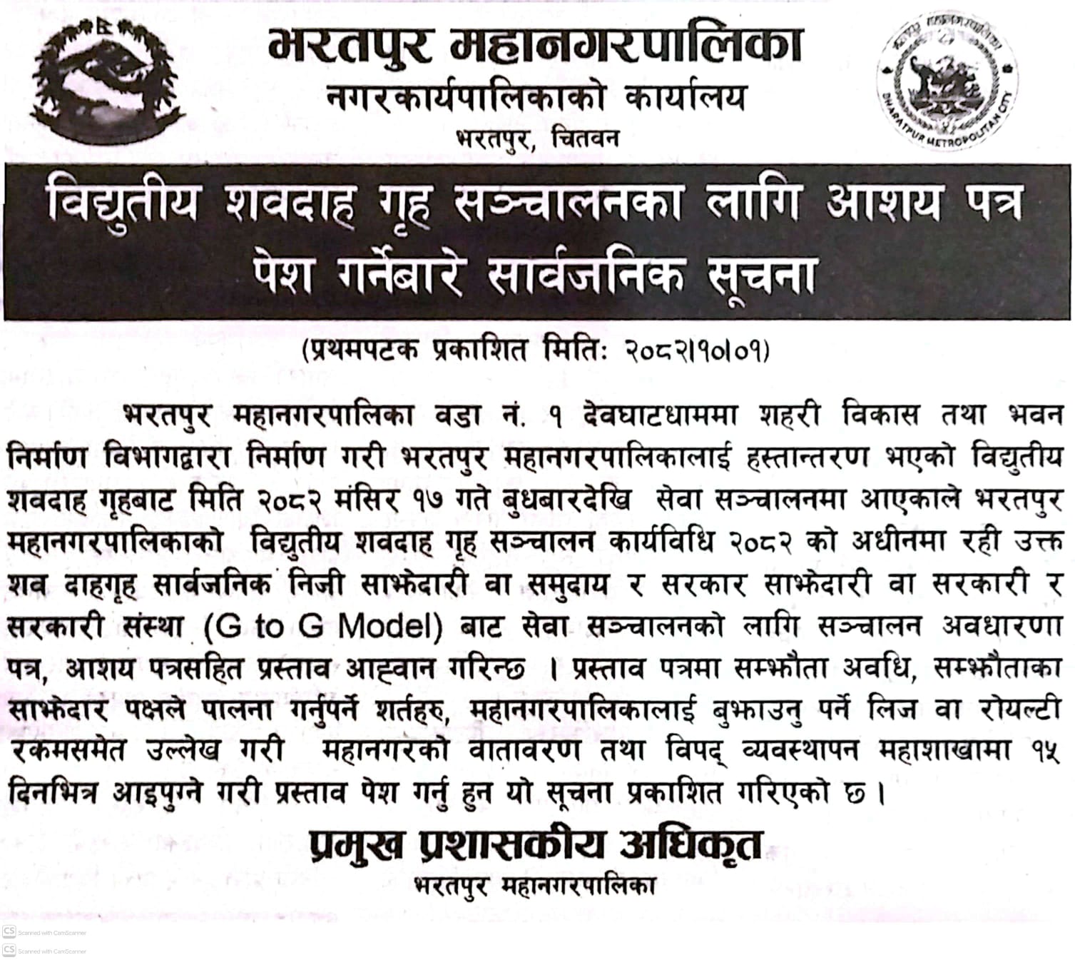 विद्युतीय शवदाह गृह सञ्चालनका लागि आशय पत्र पेश गर्नेबारे सार्वजनिक सूचना ।